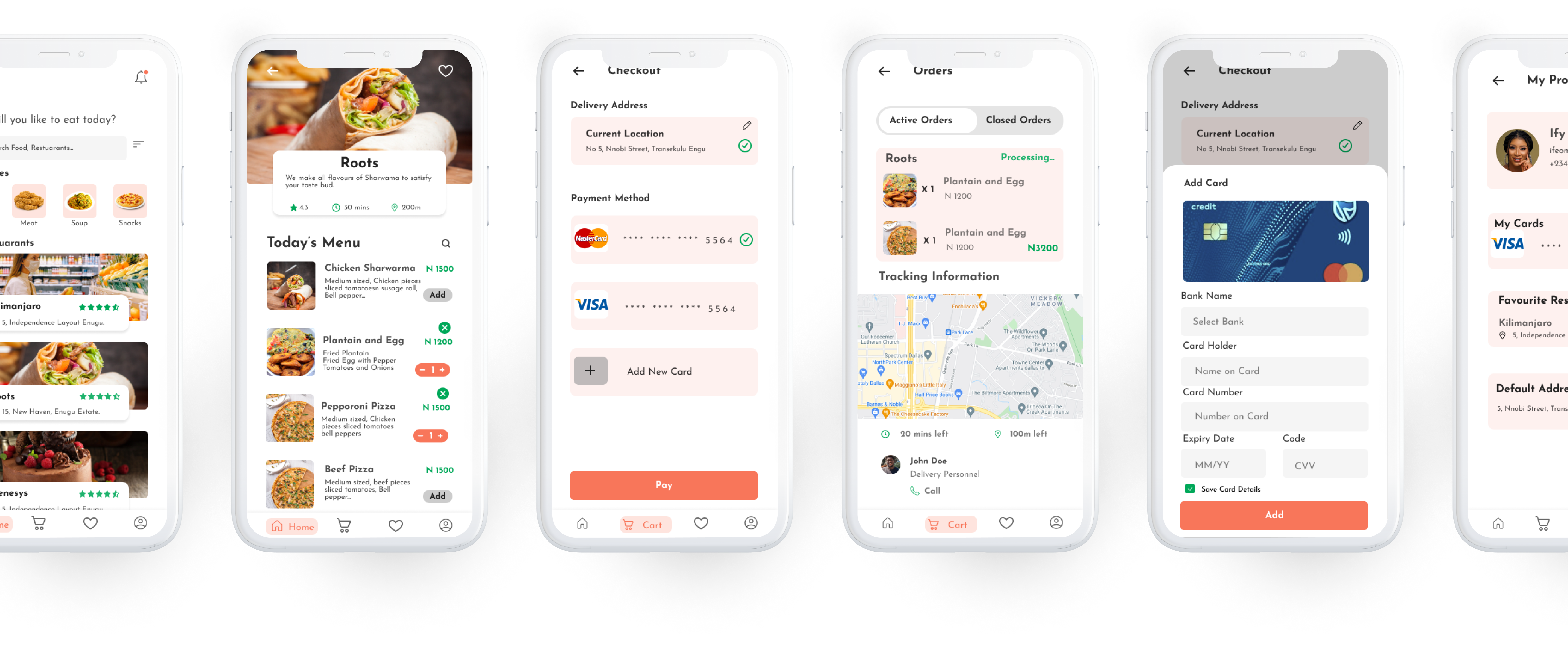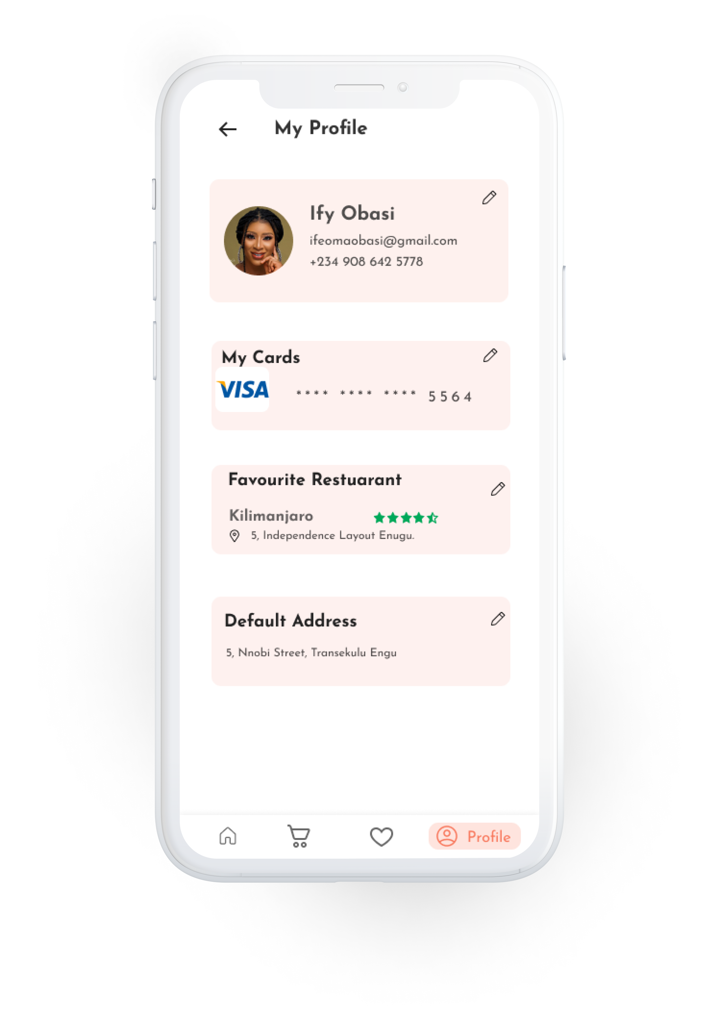 This screen contains everything about the account user - profile picture, card details, phone number, favourite restaurant, delivery address and email address.
