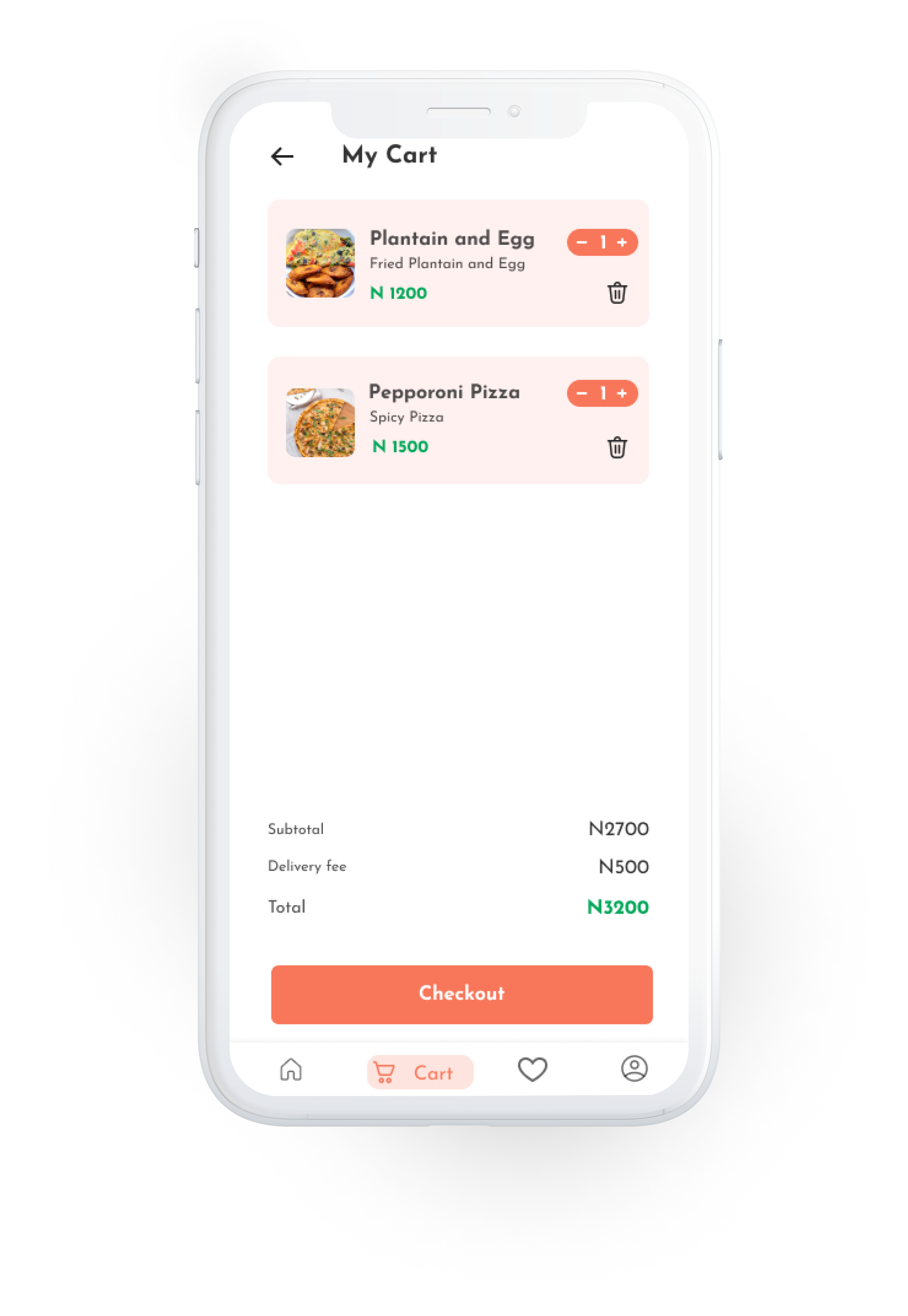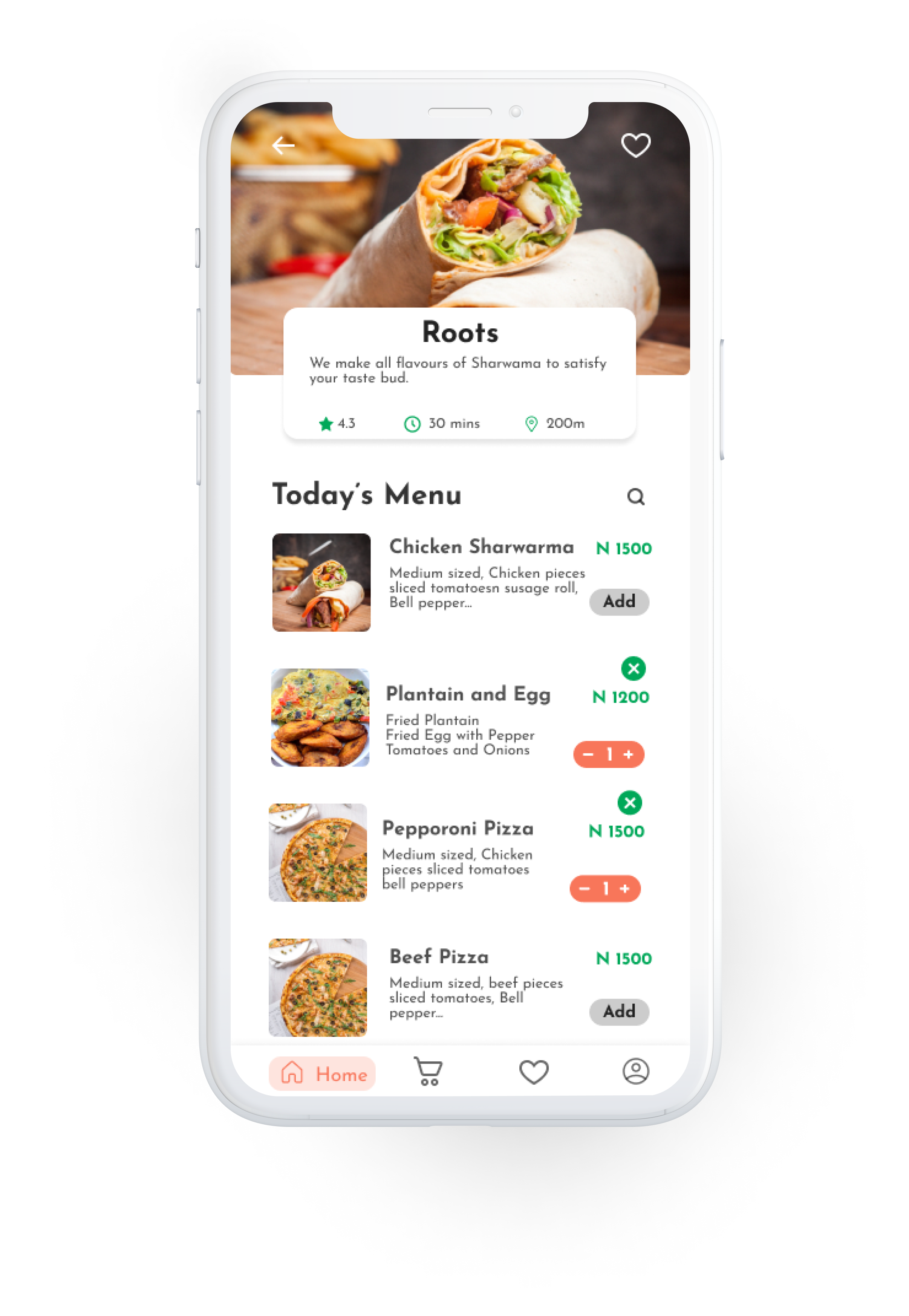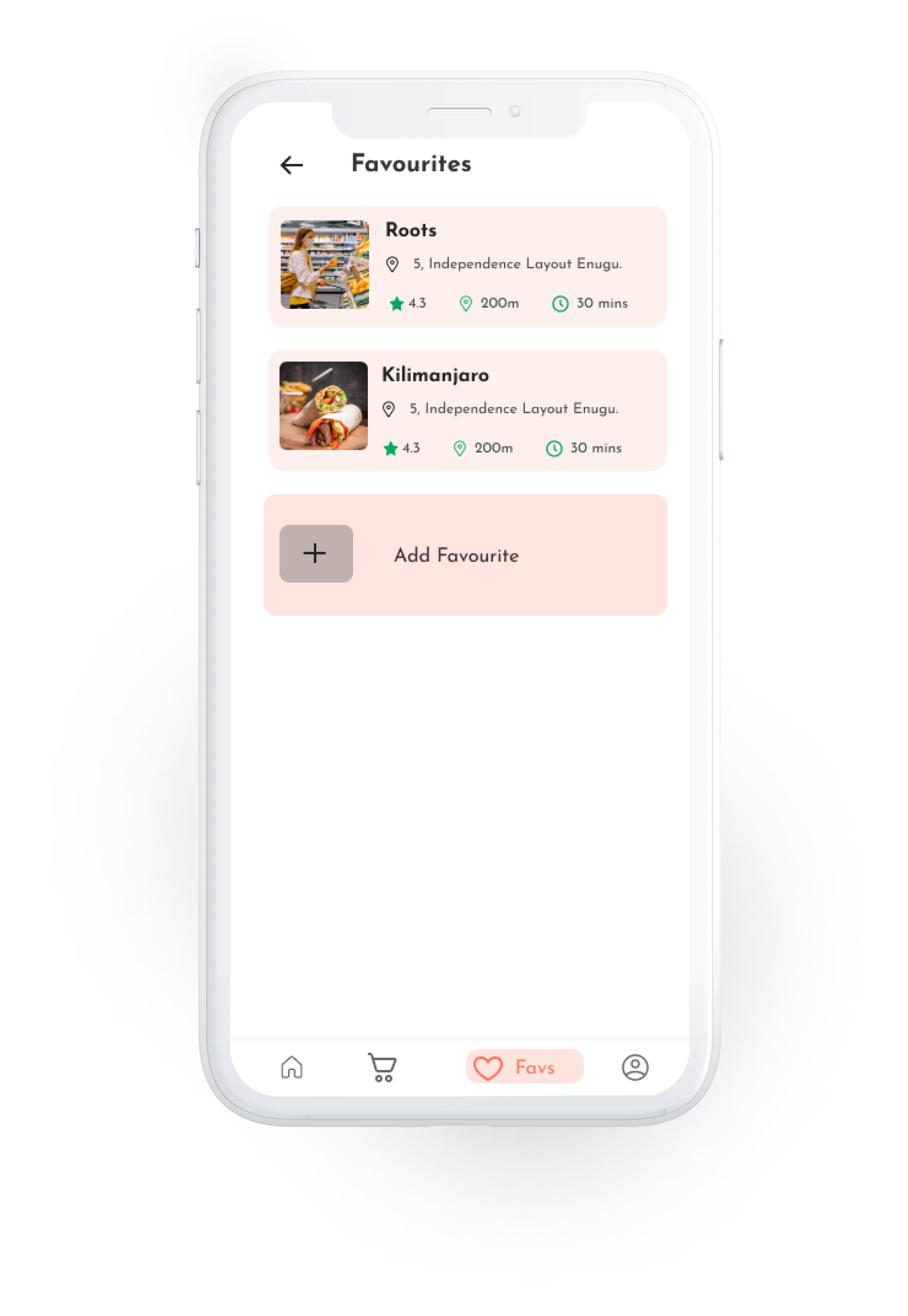 This screen contains the user’s favourite meals that has been selected from restaurant’s page or home page. It is the same as a wishlist.