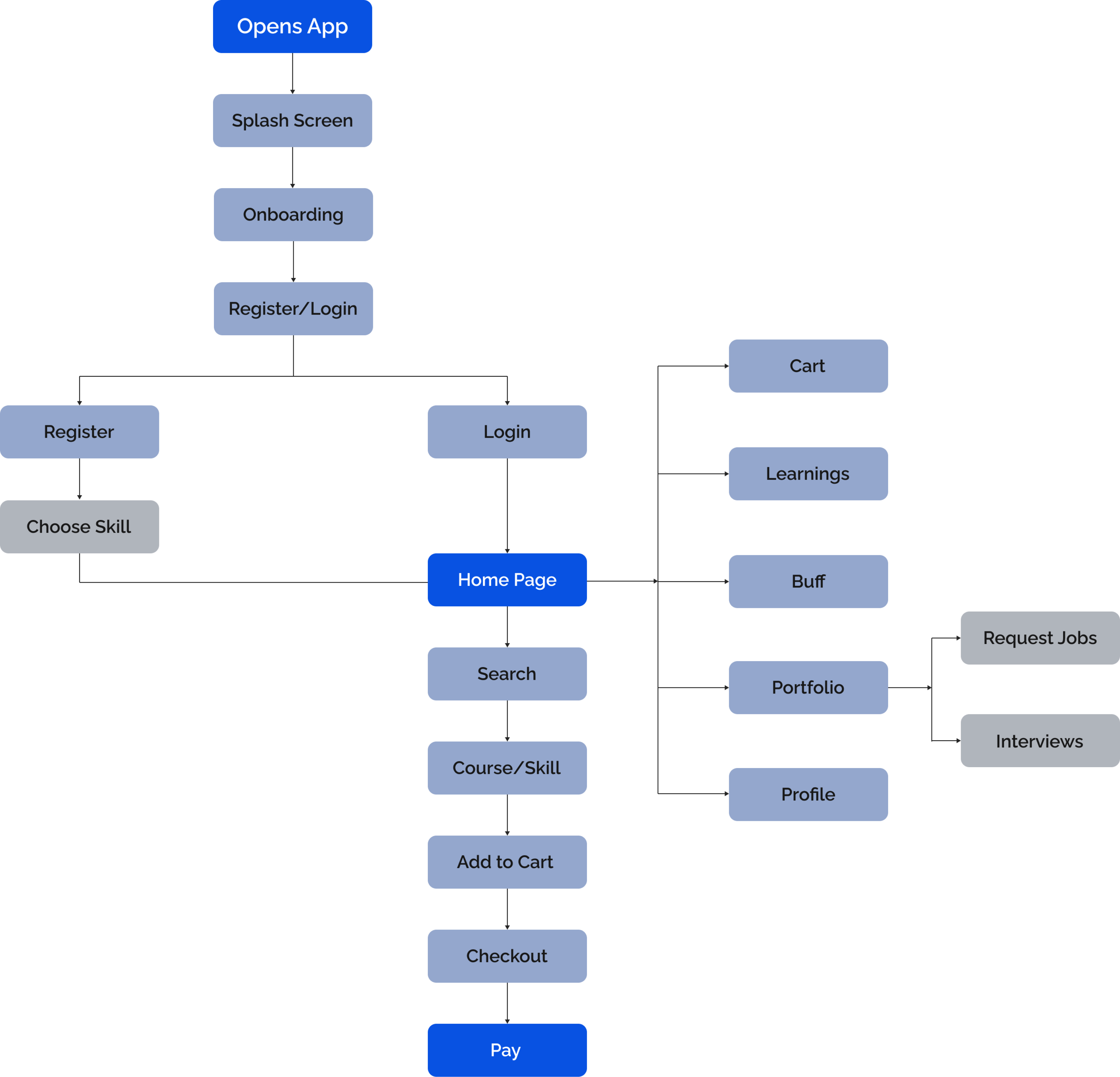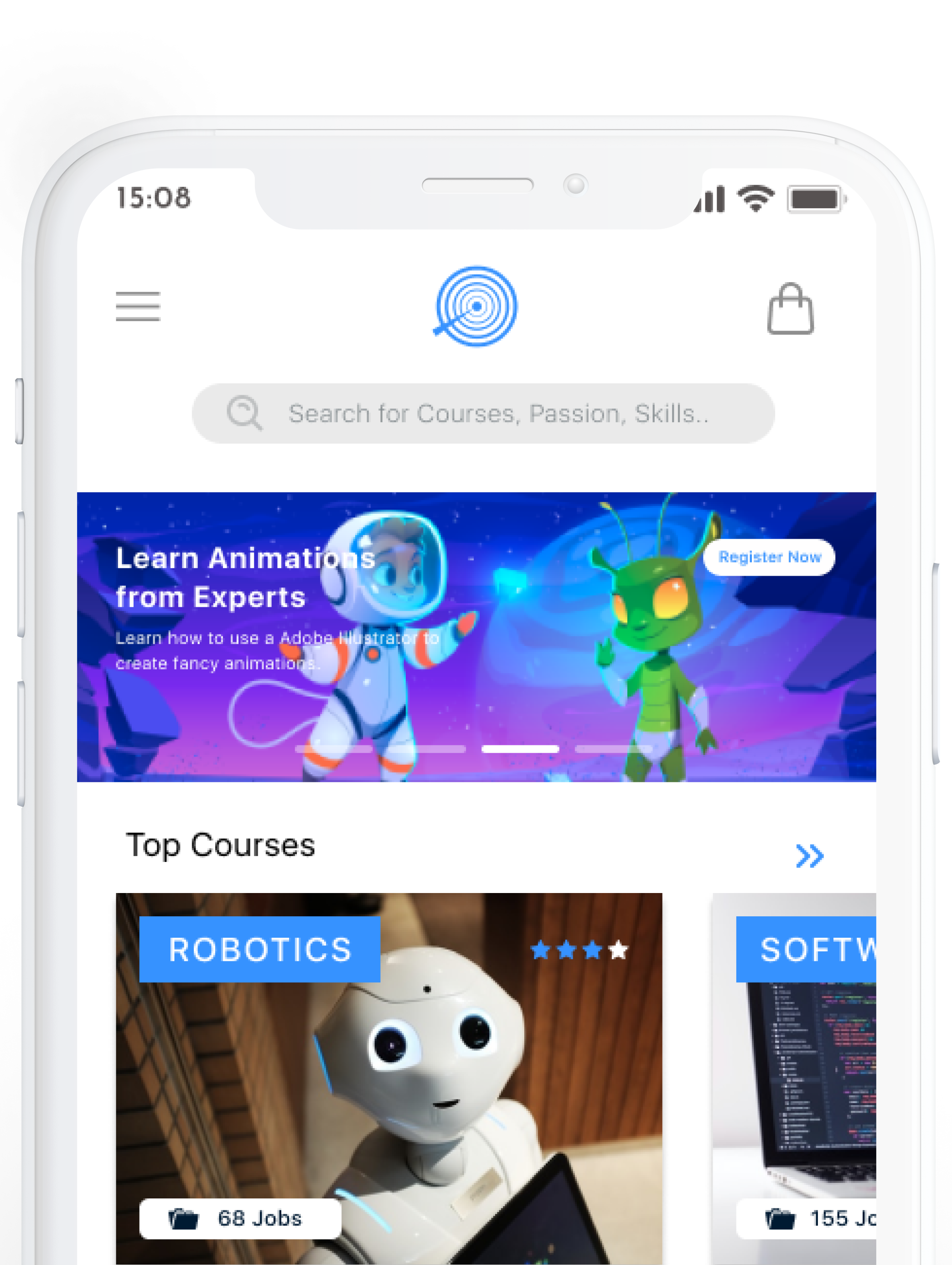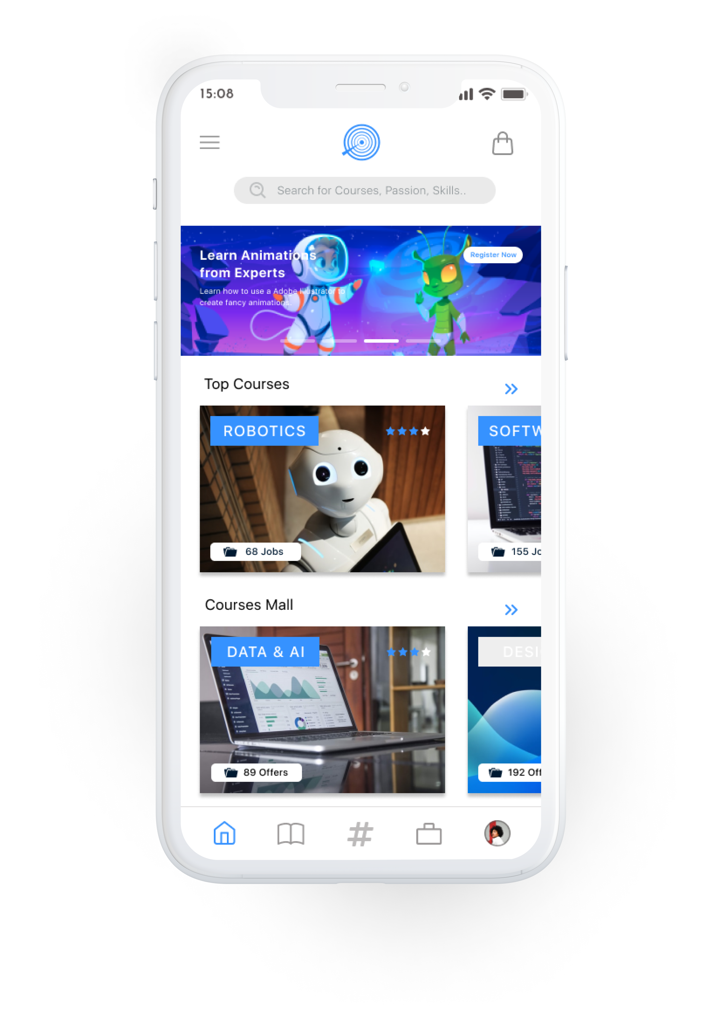 Home screen is one of the most important screen on the application which houses top courses, courses marketplace, adverts, search bar, cart, slide show.