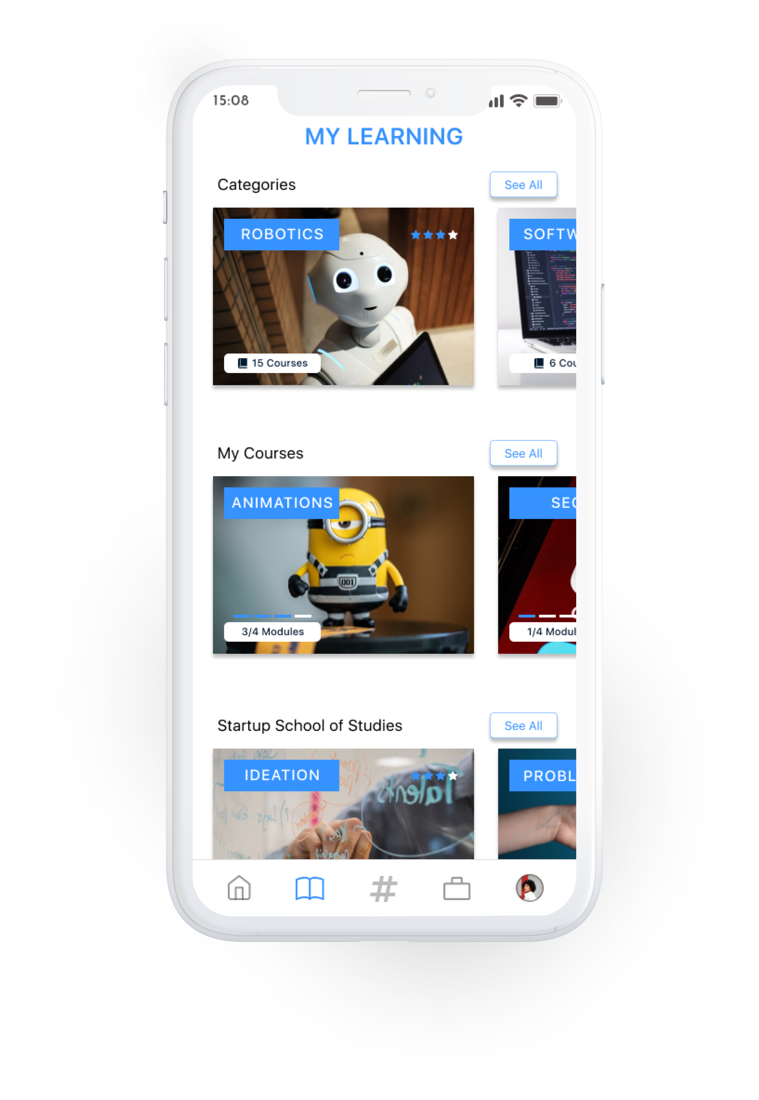 This screen contains the courses’ categories, learner’s courses and startup school of studies (entrepreneurship).