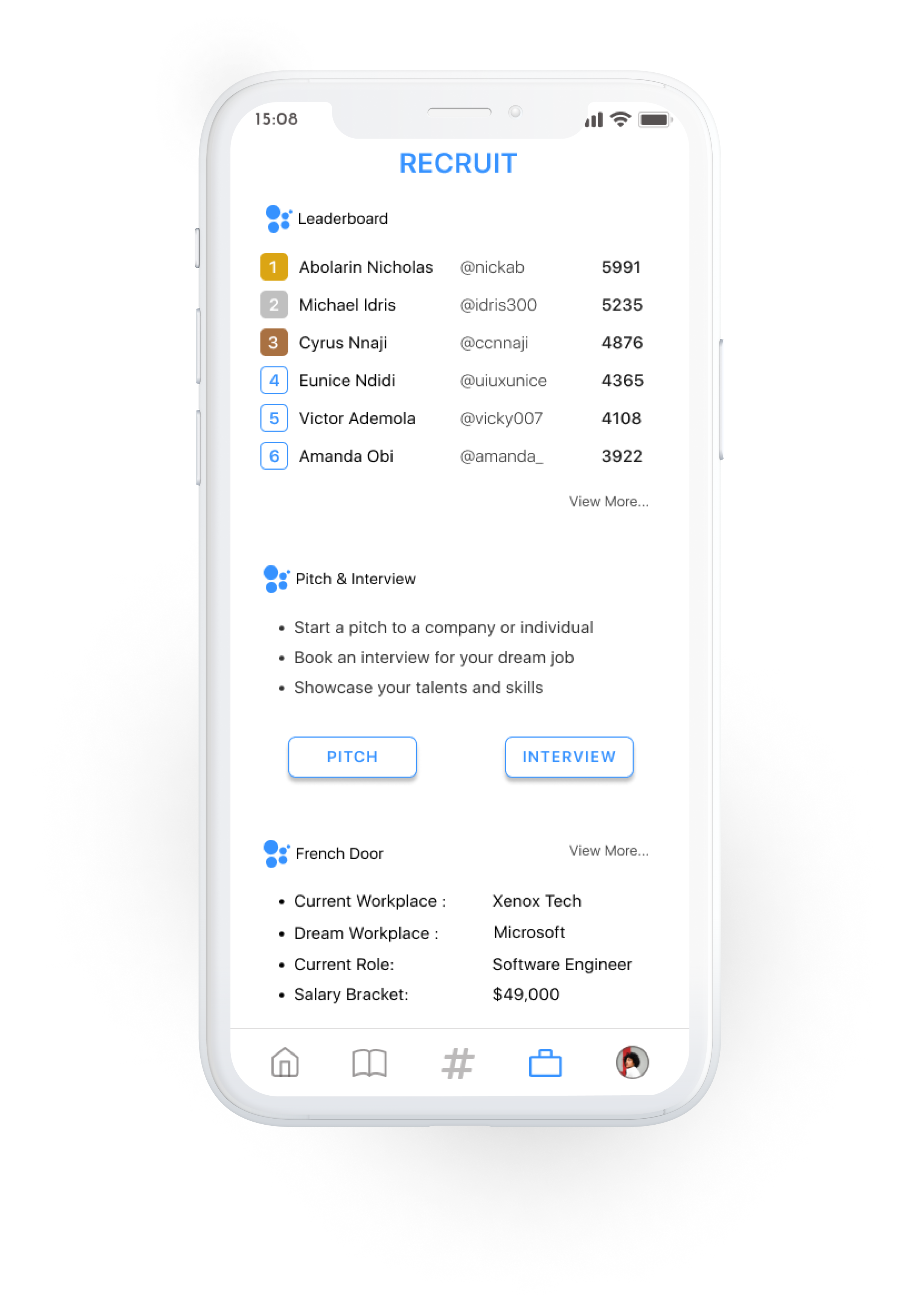 This screen contains a leaderboard for learners, Pitch or Request for an Interview form companies and a French door feature - to enable job seekers know about companies.