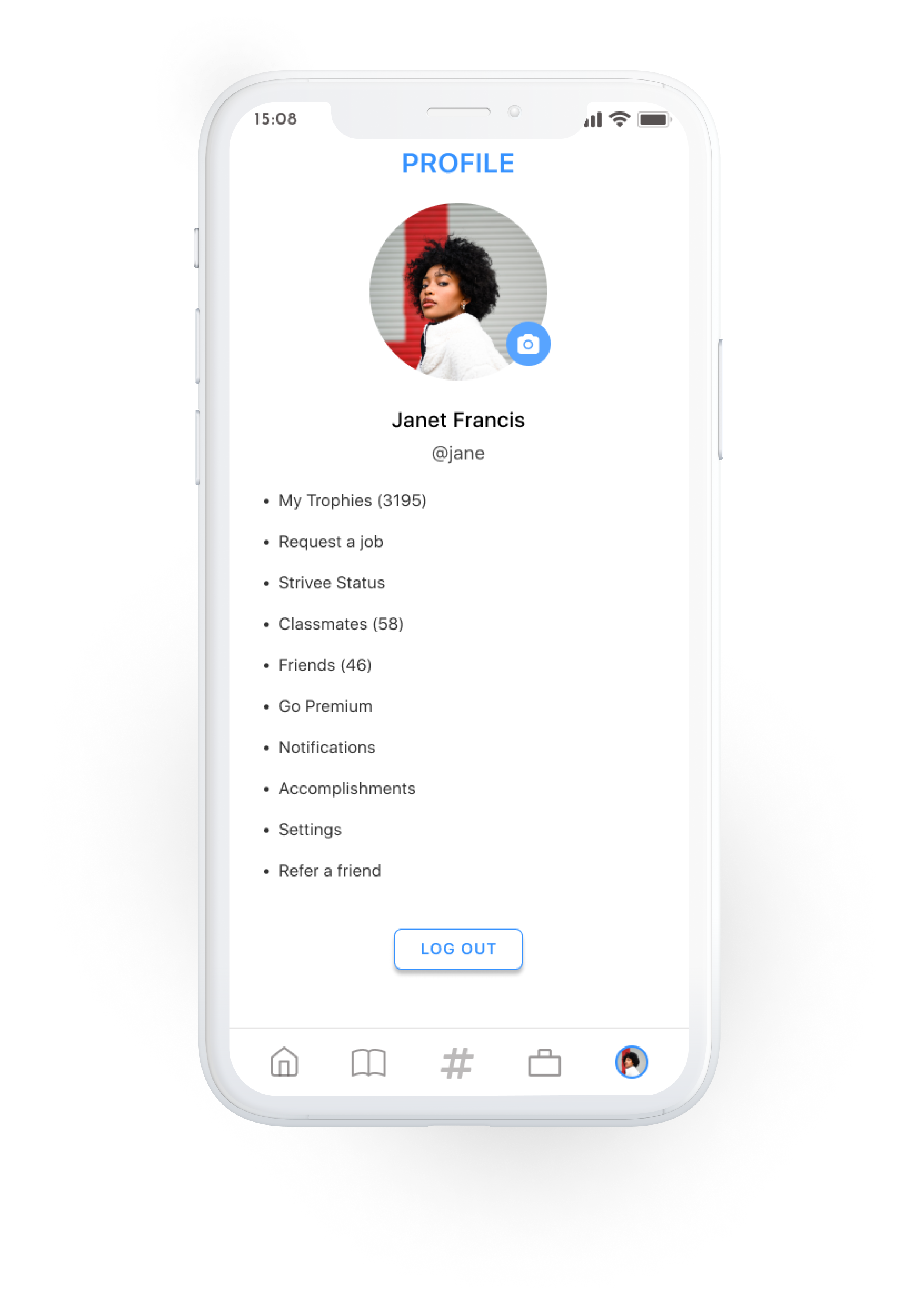 This screen contains everything about the account user - profile picture, learning status, user handle, jobs, friends, classmates, accomplishments, notifications, accounting settings and a log out button,